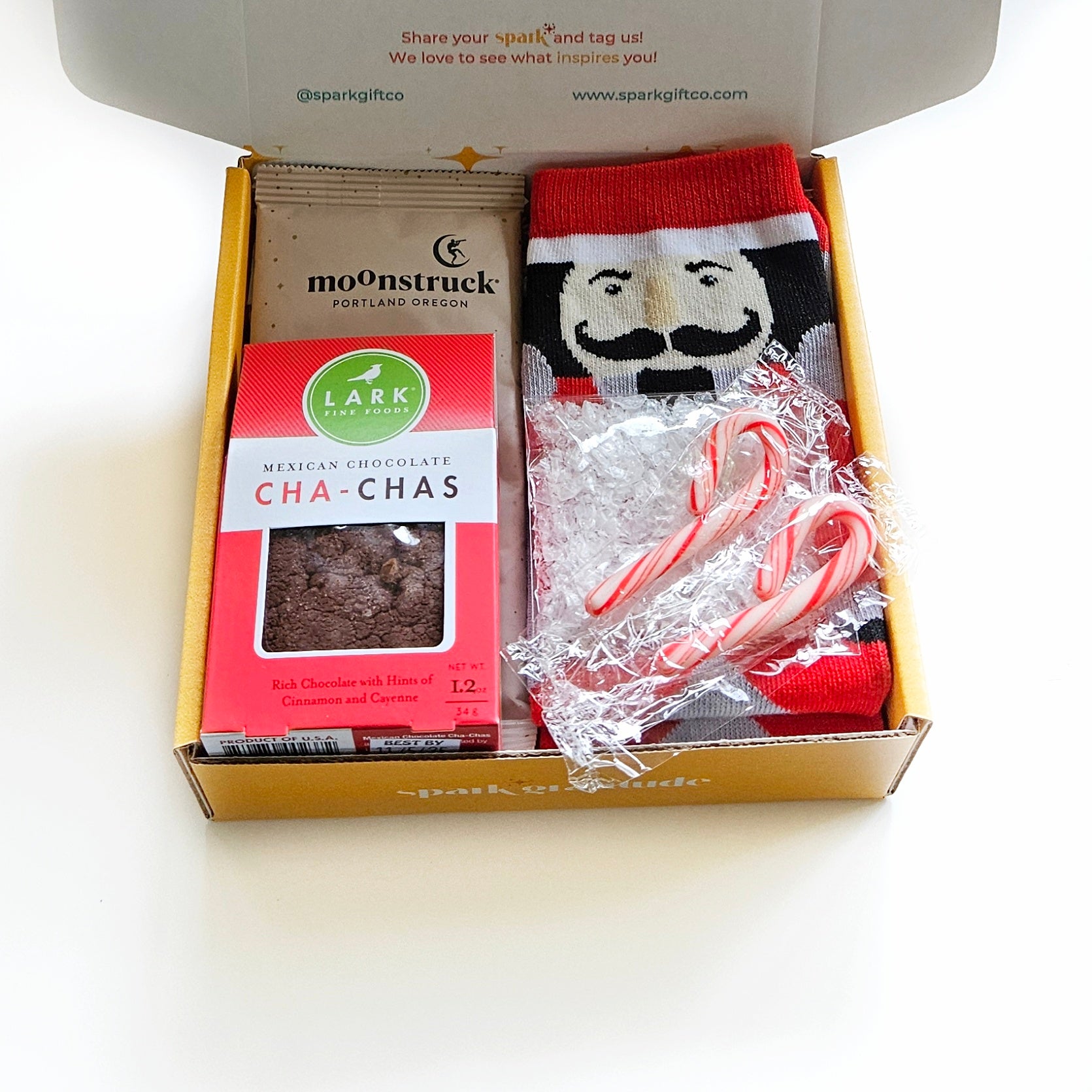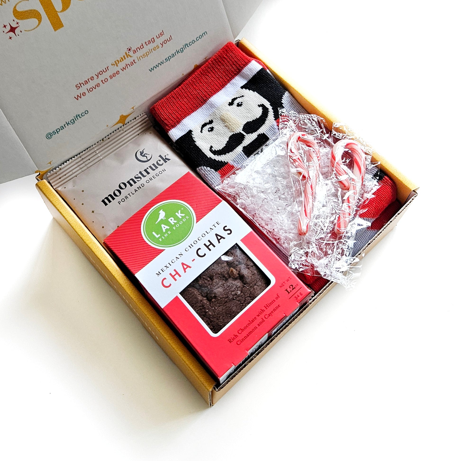 Embrace the holiday spirit with our 'Cocoa-Loco' holiday gift, a festive symphony of flavors and cheer. Each box is a winter wonderland of treats, featuring rich Mexican Chocolate Cookies and Peppermint Chocolate Covered Pretzels that dance on the palate like the season's first snowflakes. Amidst the white crinkle paper, discover the playful 'Let it Snow!' confetti pack, a classic Candy Cane, and cozy Holiday Socks to warm your toes by the fire. This gift is a heartfelt embrace in a box, complete with a personal handwritten note to convey your warmest wishes.